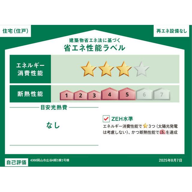 | エネルギー消費性能 | ★★★(削減率20%達成) | 断熱性能 | 5段階/7段階中 |